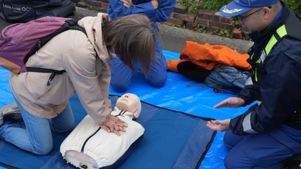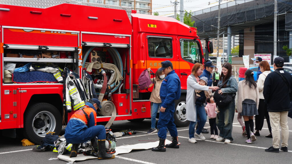 地域連携 × 安心 屋外エリアでは消防車・救急車の展示や、心肺蘇生・AEDの操作体験が行われ 、”もしも”の時への備えを学ぶ貴重な機会となりました。また、地域のお店によるグルメ販売のブースの出店、和太鼓やよさこい、吹奏楽の出し物がイベントに彩りを添えました 。
